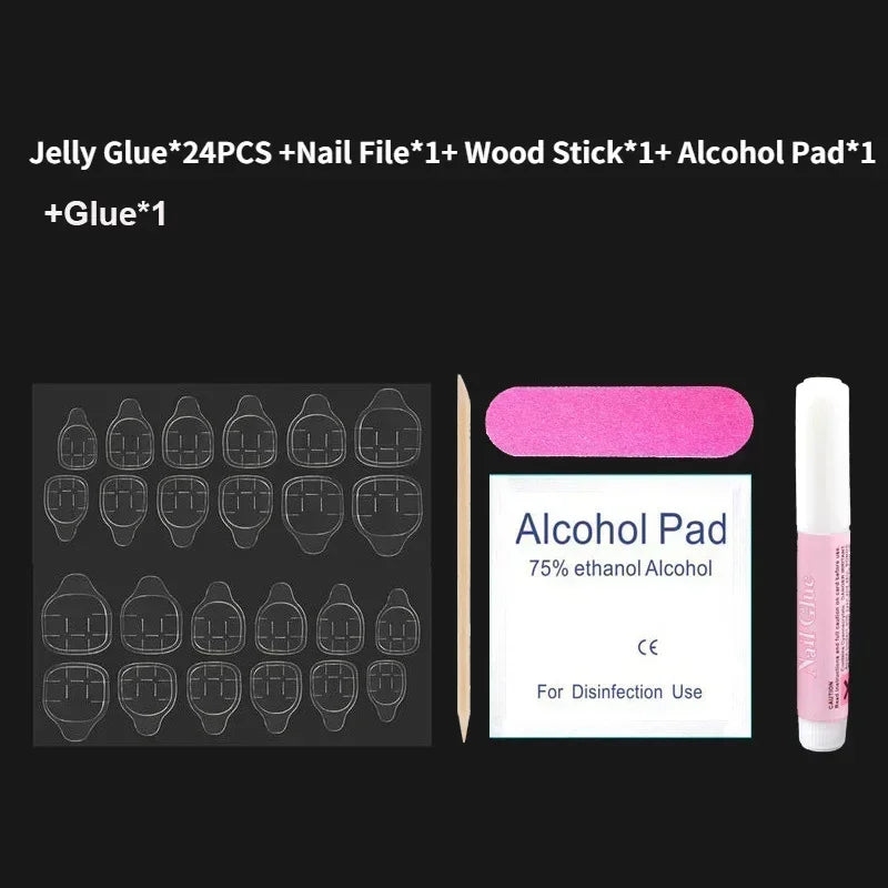 1*10pcs handmade false nails+1pcs glue+ 1PCS nail file+1pcs wood Stick+1pcs alcohol pad+24pcs jelly glue