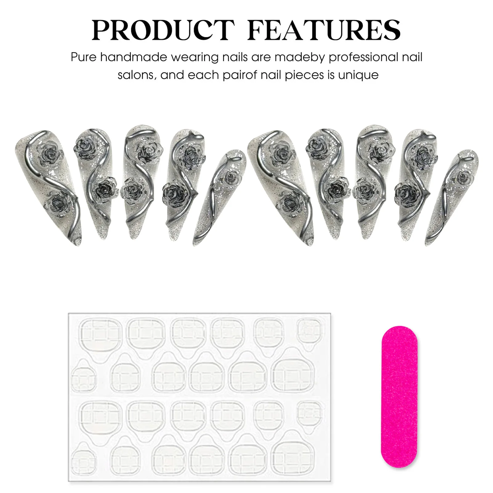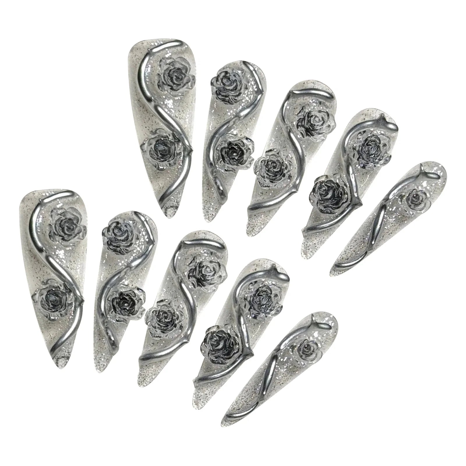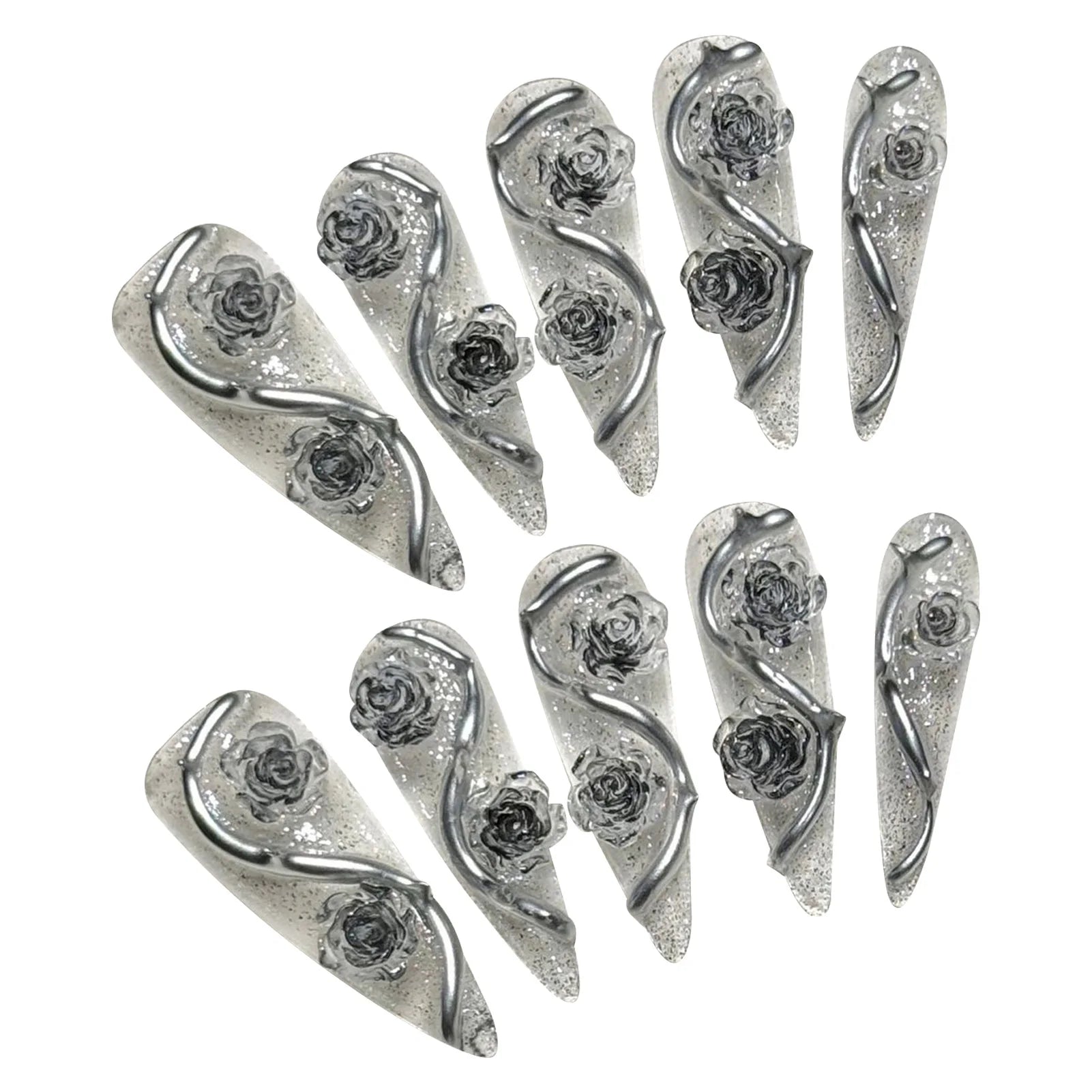 10pcs Long Stiletto Press On Nails Handmade 3D Sliver Rose Flower Decor False Nail Tips Transparent Sequins Removable Fake Nails