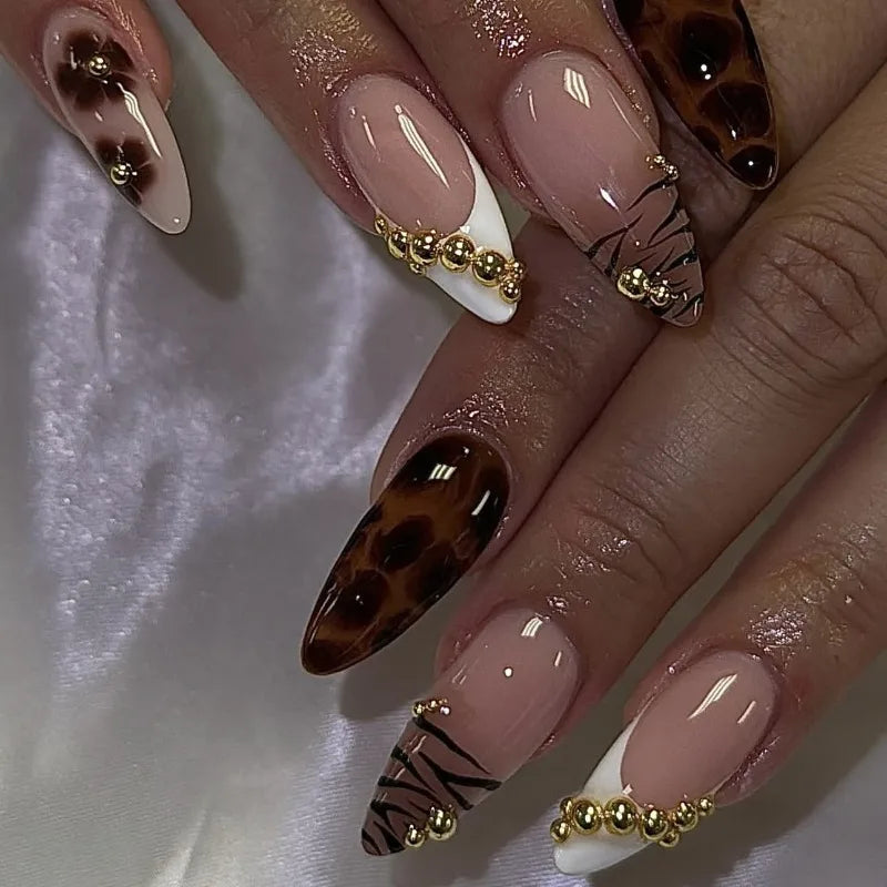 24PCS Almond Shape Fake Nails Leopard Print French Edge Press on Nails Ins Style High Quality Wearable Nails Elegant Manicure