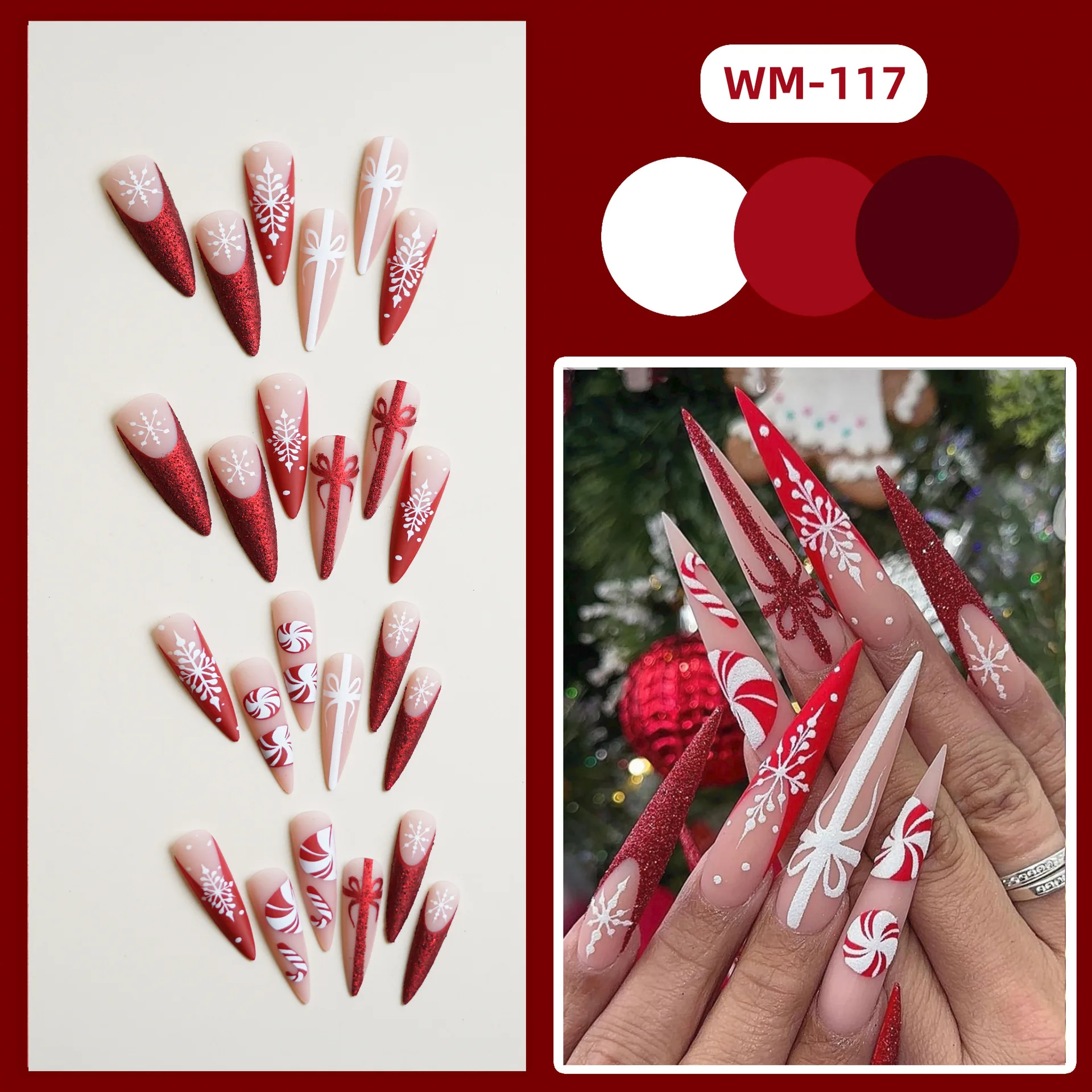 24pcs Christmas Fake Nails Long Stiletto Press On Acrylic Nails Almond Glitter Red French False Nails White Snowflake Wearable
