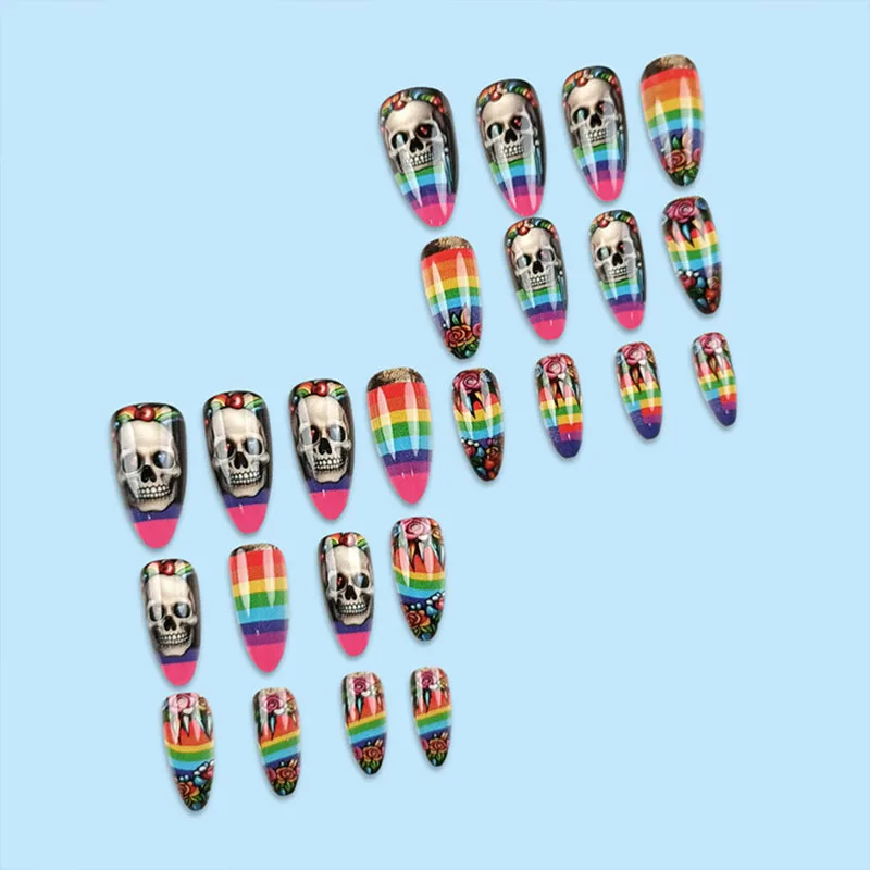 24Pcs Long Almond Press on Nails - Halloween Design with Rainbow Stripes, White Grinning Skull and Colorful Flowers